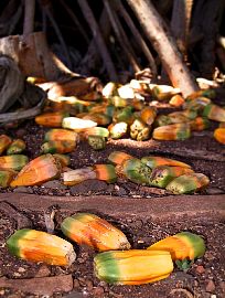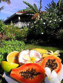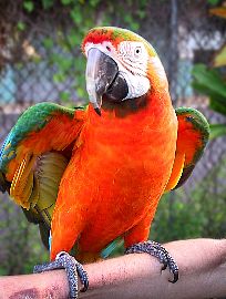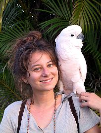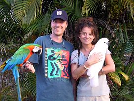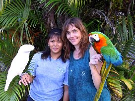 Az igen jó beszélőkével megáldott eladó hölgy elmesélte, hogy a Nihaui asszonyok nem fő foglalkozásként űzik a kagylóékszer-készítést, ez csak kiegészítő kereset számukra. Az egész család részt vesz az előkészületben, közösen gyűjtik, válogatják a kagylókat. Az összegyűjtött kagylók 4/5 része a szemétben landol: ezek szín vagy méret hibásak, vagy töröttek. A család férfi tagjai a kagylók kilyukasztásában is segédkeznek, ez bicikli küllővel történik! Ezt a fajta kagylófűzést azt hiszem a csipkeveréshez, a lószőrből való ékszerkészítéshez tudnám bonyolultságában a leginkább hasonlítani. Hagyományos mintákkal dolgoznak, a 80-as években találtak ki egy új fajtát, egyébként ugyanazokat a motívumokat fűzik, mint dédnagymamáik. Az eladó hölgy egy profi idegenvezetőnél nagyobb lelkesedéssel válaszolt minden kérdésünkre, egy-egy mondat között hatalmasakat nevetett és közben folyamatosan bólogatott. Magunk között már csak "bólogatós nőnek" hívtuk. Viselkedésében leginkább egy kakadura hasonlított, de jó értelemben. Tőle tudtuk meg azt is, hogy a tiltott szigeten élők csak kizárólag hawaiival házasodhatnak, akinek erről más az elképzelése, annak el kell hagynia a szigetet. Egyébként a komfort hiánya ellenére az emberek nagyon boldogan élnek és nem kívánkoznak sehova. Ez alól csak a fiatalabb korosztály a kivétel, ők Kauai-ra járnak iskolába, és utána már nem nagyon kívánkoznak vissza Nihaura. Azt is megkérdeztük, hogy mi a véleménye a turistákról, rendesen viselkednek-e, szoktak-e butaságokat kérdezni, stb. A hölgy szerint még mindig az Amerikaiak viszik el a pálmát tudatlanságban: tőle egyszer azt kérdezték, hogy szalmafedeles kunyhóban lakik-e a strandon és tudja-e hogy mi az a mikrohullámú sütő... Leginkább annak örült, hogy a hurrikánok azért néha-néha beköszönnek a szigetre, jelentős rombolást hagyva maguk után. Ez komoly mértékben visszatartja az üzletembereket a nagyobb beruházásoktól, így talán soha nem fog annyira elvárosiasodni, mint Ohau vagy Maui. Turistákra természetesen szükségük van, mert ebből élnek, de a mostani mennyiség éppen elegendő. Egy kis strandolást követően az eredeti vörös agyaggal festett pólókat áruló boltban kötöttünk ki. Ottó szeretett volna magának egy Humhumunukunukuapuaa-t ábrázoló pólót. Na ki emlékszik arra, hogy ez mit jelent? Pólót végül nem vettünk, de ismét elbeszélgettünk a tulajjal, aki leginkább egy kedves drogos benyomását keltette és éppen a boltot festette. Kb. 10 percnyi ismeretség után már azt részletezte, hogy a férje elég garasos, csak a sziget északi partjára mentek egy hétre nyaralni, ami azért elég unalmas, nem? Két napos hawaii tartózkodásom után én egy csöppet sem gondoltam így! Ő inkább Mauira ment volna, mert ott nőtt fel, és hiányzott neki az éjszakai élet. Mindenesetre nagyon kedves volt és felajánlotta hogy fényképezkedjünk le a papagájaival. A papagájok szemmel láthatólag élvezték, hogy játszottunk velük egy kicsit. A boltban dolgozó másik lány nagyon félt a narancssárga színűtől, mert az csak fiúkkal barátkozik, a lányokat megkergeti és megcsipkedi. A papagájok elég nehezek voltak, a karmaik pedig nagyon hegyesek, pár perc alatt is jól megböködték a bőrünket.