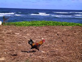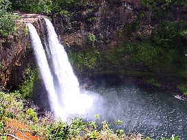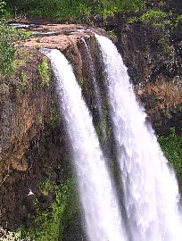 Ezen a napon a keleti part felé indultunk. Az egyik autóval is megközelíthető vízesés volt az első állomáshely. Az út a "Tunnel of Trees" azaz a fák alagutján vezetett keresztül. A körülöttünk lévő látvány lenyűgöző volt, megpróbálom szavakba önteni: közvetlenül mellettünk az út két oldalán hihetetlen zöld színű mező pompázott, a hátteret párától gőzölgő hegyvonulat sziluettje keretezte, fölöttünk az ég kacagó kékjét tökéletesre szabott ismeretlen formájú felhők díszítették, majd az égig érő fák összekapaszkodó lombkoronája tetőzte be a látványt. A Wailua vízeséshez az 580-as út vezet. Ennek végén egy parkoló van, itt már elég sokan voltak. A parkolóban ismét tyúkokkal incselkedtünk. Számunkra még mindig furcsa volt hogy mindenfelé szabadon kószáltak. A vízesés szép volt, de csak fentről lehetett megnézni, nem lehetett közelebb menni hozzá. Szerencsére eső után lehettünk, mert két ága duzzadtan huppant a szakadék alá. A vízesés medencéjénak falát az állandó pára miatt benőtték a növények, ezek között fészkeltek fehér, egzotikus kinézetű madarak. Mindkét alábbi képen látszik egy-egy ilyan madár repülés közben!