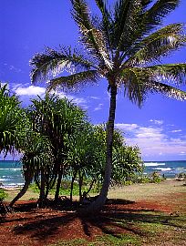 A meleg elől a közeli Kókuszpálma Bevásárló Központba húzódtunk. Itt többnyire a turisták ajándékvásárlási igényeit kielégítő boltokkal találkoztunk. Volt néhány igen nívós is, pl. amelyik hajó maketteket és csontnyelű késeket, Aloha selyem ingeket vagy Nihau-i kagyló ékszereket árult. Ez utóbbi boltban elég sokat időztünk. Elsőként az apró (kb. rizs szem nagyságú) rózsaszínű kagylókból, sziszifuszi munkával készült láncokat csodáltam meg. Volt közöttük többsoros több ezer dollárért, egysoros pár százért. A legolcsóbb is $145-ba került. Nagyon tetszettek, de nem vettem semmit, sajnos rózsaszínes árnyalatuk nem igazán illett a bőröm színéhez.
